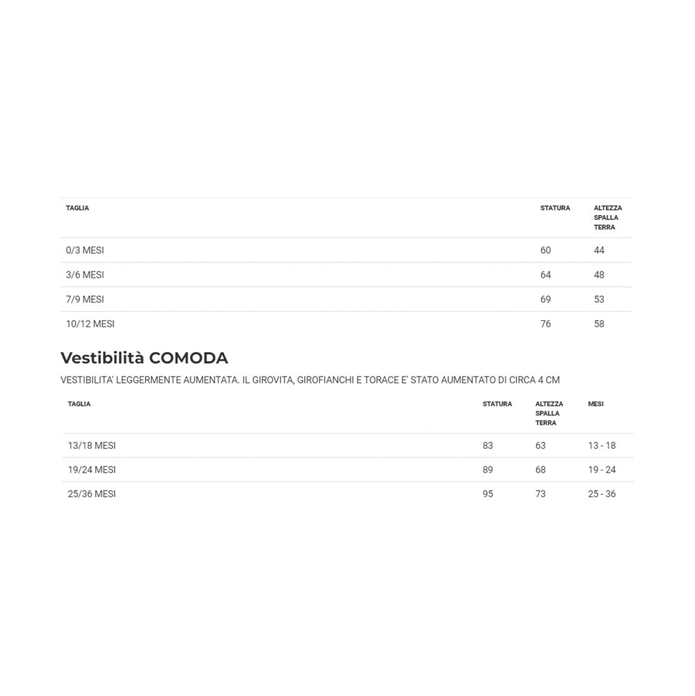 Il costume di Babbo Natale Primi Passi è disponibile in 3 taglie, da 0/3 mesi fino a 25/36 mesi. Confezionato in un pratico scatolo dalle dimensioni 7x20x27 cm, include tutina e cappello.