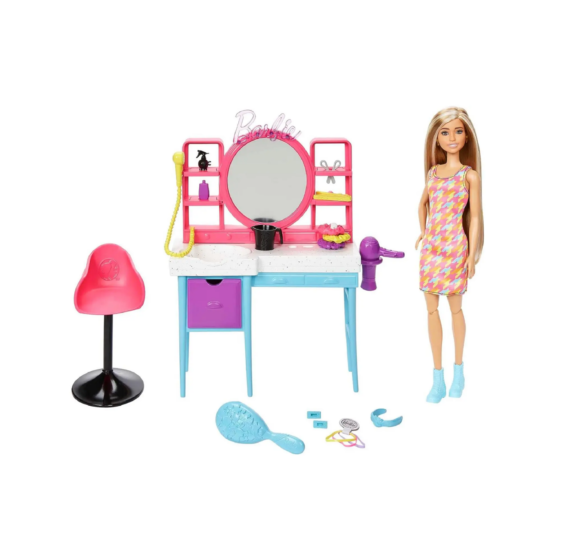 Il Playset Salone di Bellezza Barbie è l'articolo ideale per stimolare la creatività dei bambini! Con Barbie, che ha capelli lunghi 15 cm e un effetto cambia colore, il divertimento non finisce mai. Crea acconciature uniche grazie a più di 15 accessori inclusi nel set. Barbie sfoggia un abito colorato con stampa pied-de-poule e stivaletti blu, pronta per ogni occasione! Perfetto per ore di gioco creativo, le bambine e i bambini potranno divertirsi a realizzare infinite acconciature e storie ispirate al mondo della bellezza.