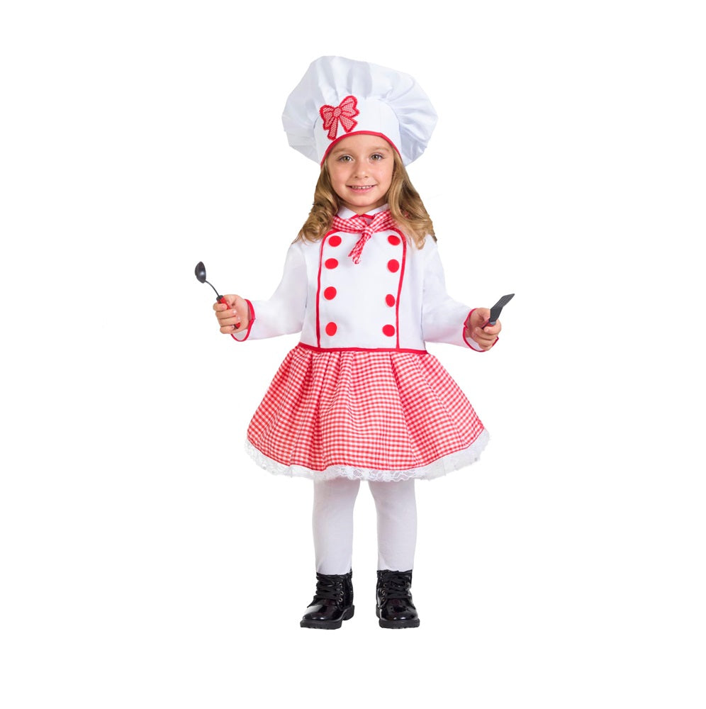 Design Italiano: la giacca bianca in tela è impreziosita da un foulard in fantasia quadri bianco e rosso, finti bottoni rossi e cuciture in sbieco rosso. La gonna, comoda grazie all’elastico in vita, è decorata con pizzo e tulle per maggiore volume. Il cappello da chef è realizzato in raso opaco bianco, con rinforzo interno e un grazioso ricamo a forma di fiocco.