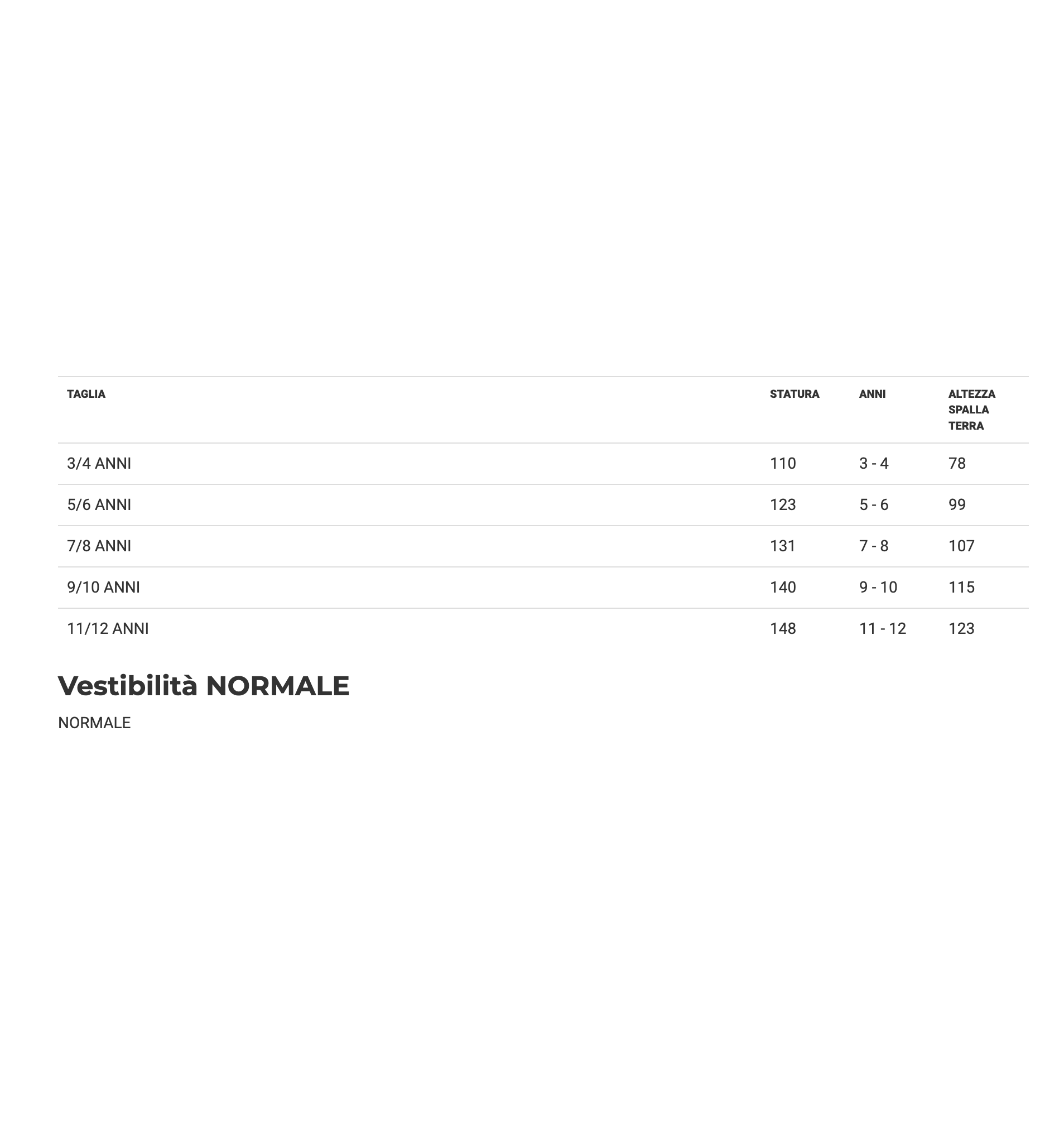 - Disponibile in 5 taglie: da 3/4 a 11/12 anni