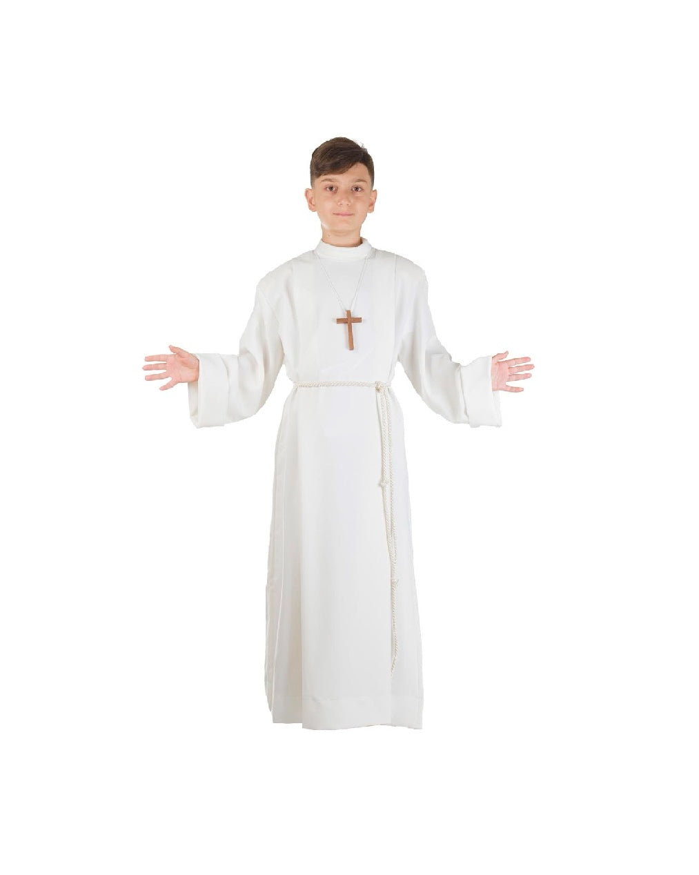 Disponibile in 7 taglie, da 105 cm a 140 cm di altezza, la tunica è fornita completa di cingolo e croce, per un look completo e conforme alla cerimonia religiosa.