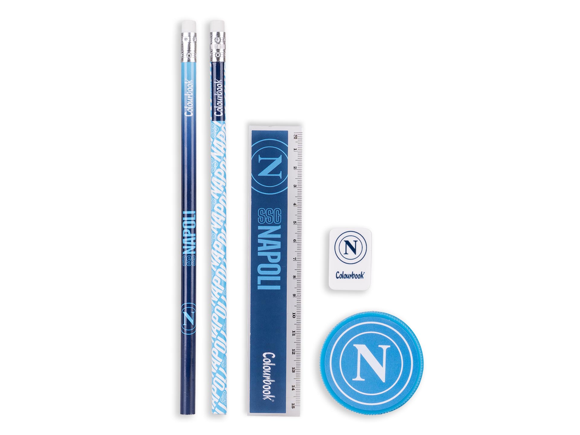 Il Set di Cancelleria SSC Napoli by Colourbook è perfetto per ogni tifoso che vuole portare il proprio amore per la squadra anche a scuola. Questo set completo di 14 pezzi essenziali include 2 matite, 1 temperino, 1 block notes, 1 gomma, 1 righello, 2 penne e 6 matite colorate, il tutto realizzato con cura per i dettagli. Unisciti alla squadra e porta il Napoli anche nel tuo zaino con questo set pratico e stiloso!