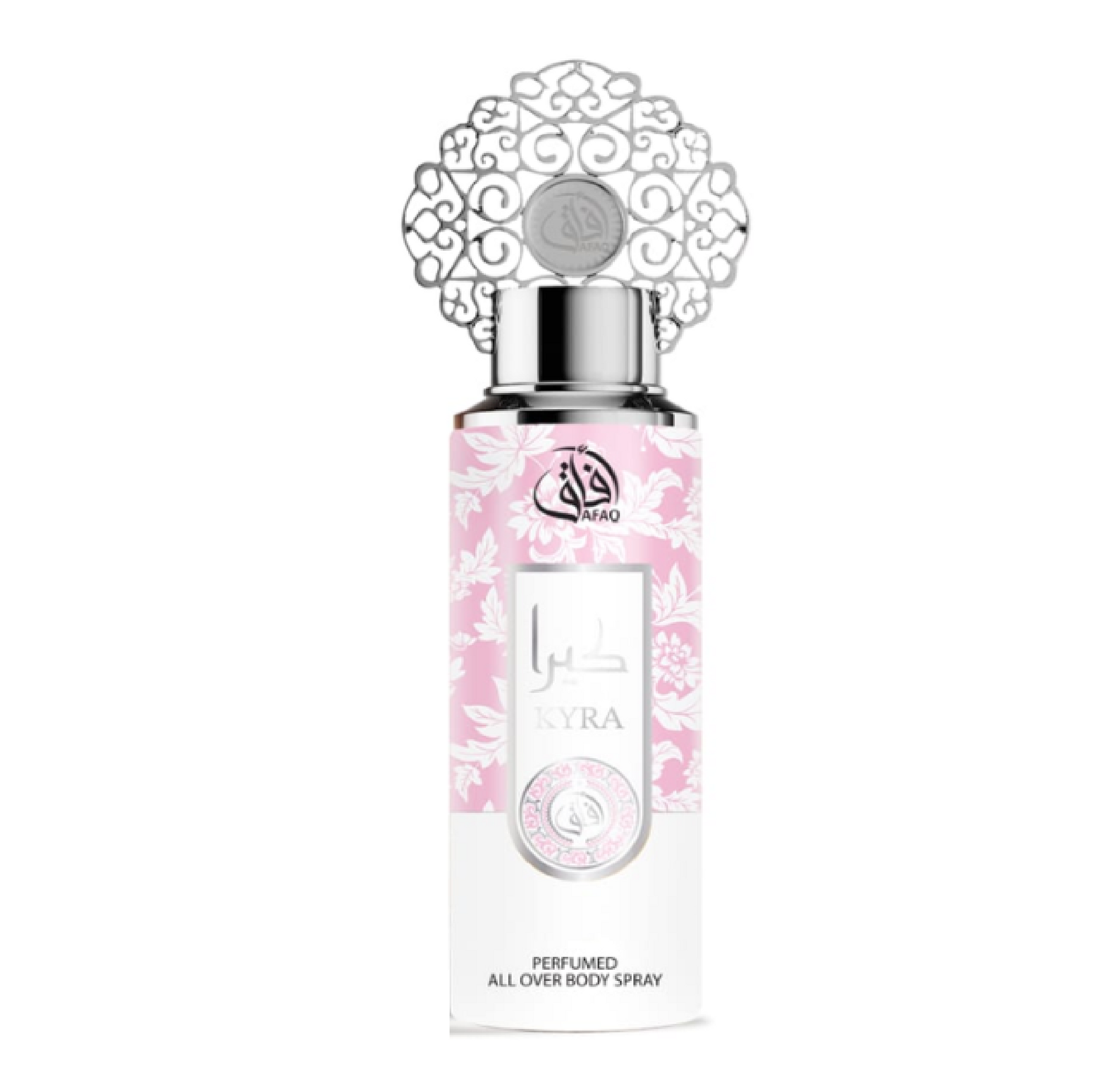 AFAQ Body Spray Kyra 200ml è un body spray femminile, una delle fragranze più amate per la sua dolcezza cremosa e il suo stile moderno. Ideale per chi cerca un profumo delicato ma persistente, elegante e avvolgente.