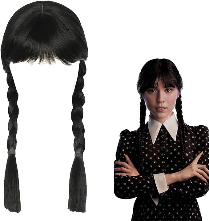 Completa il tuo look gotico con questa parrucca ispirata a Mercoledì Addams, perfetta per Halloween, cosplay, feste a tema, eventi anime, fumetti, sfilate o semplicemente per divertirsi con un nuovo stile!