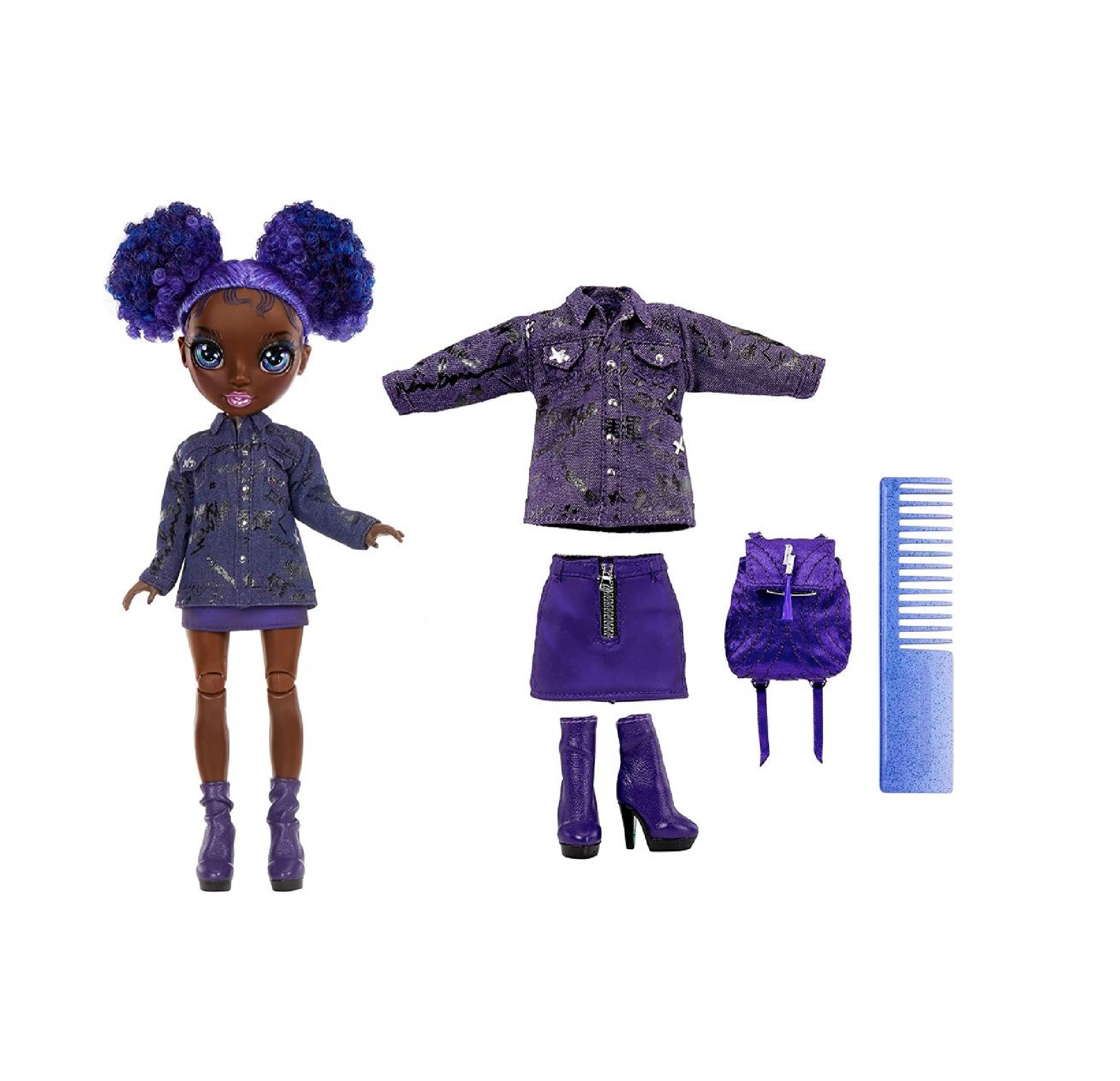 Krystal Bailey di Rainbow High è la bambola che ispira creatività e sogni! Vesti in un elegante completo viola dalla testa ai piedi, Krystal sogna di diventare redattrice capo per una rivista d'arte. Con i suoi splendidi capelli ricci in due chignon e occhi scintillanti, questa bambola è perfetta per chi ama la moda. Indossa una giacca di jeans con borchie, una gonna viola, stivaletti e vari accessori, incluso uno zaino in morbido raso che si apre e si chiude. Krystal è completamente articolata e snodabile, permettendole di assumere pose glamour. La bambola è accompagnata da un pettine, calzini, fiocco per capelli e un telefono per le sue interviste improvvisate. Aggiungila alla tua collezione Rainbow High e fai volare la tua immaginazione!