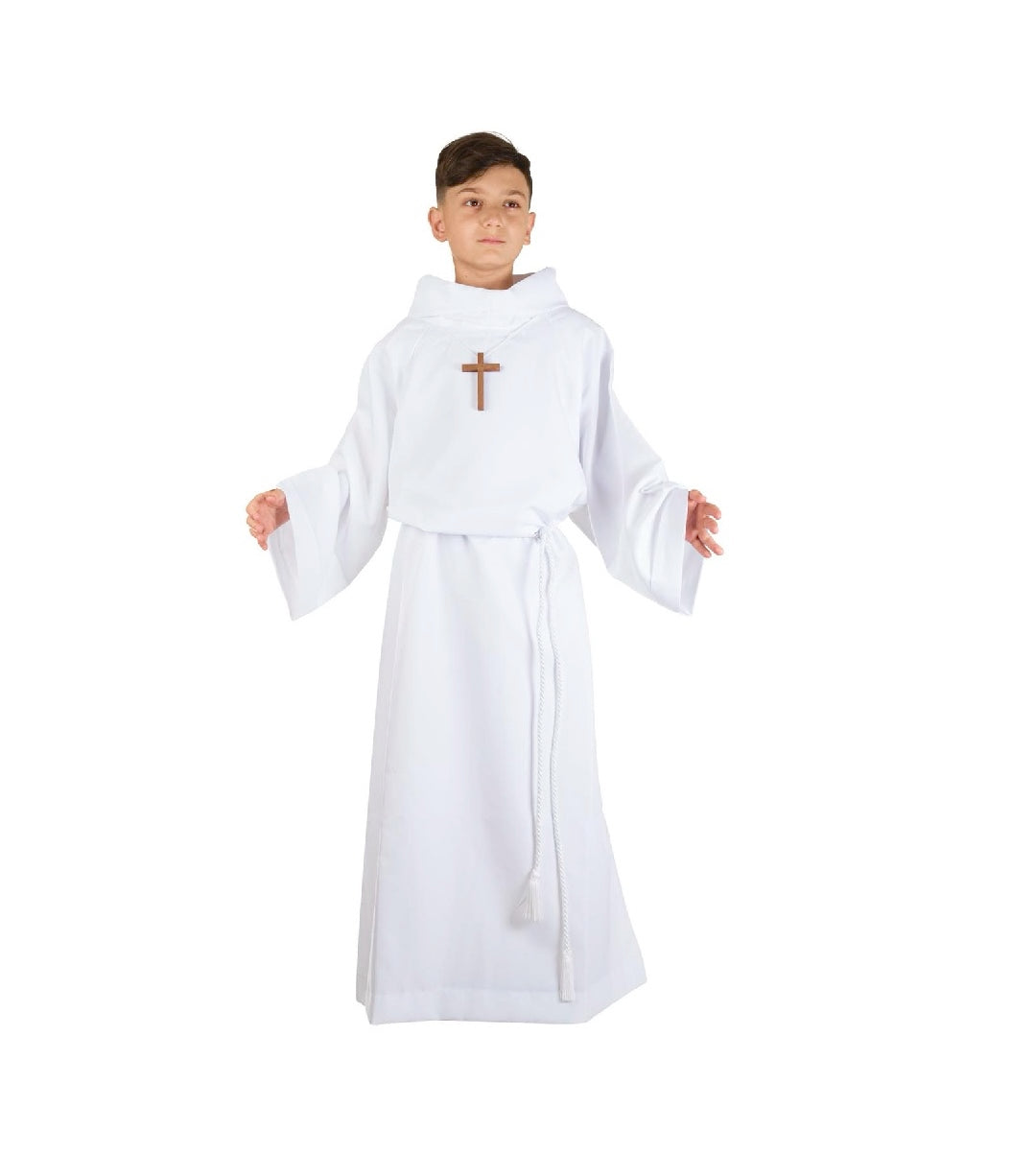 Disponibile in 7 taglie, da 105 cm a 140 cm, è dotata di un cappuccio che dona un tocco distintivo, e include il cingolo e la croce, ideali per completare l’outfit sacro.